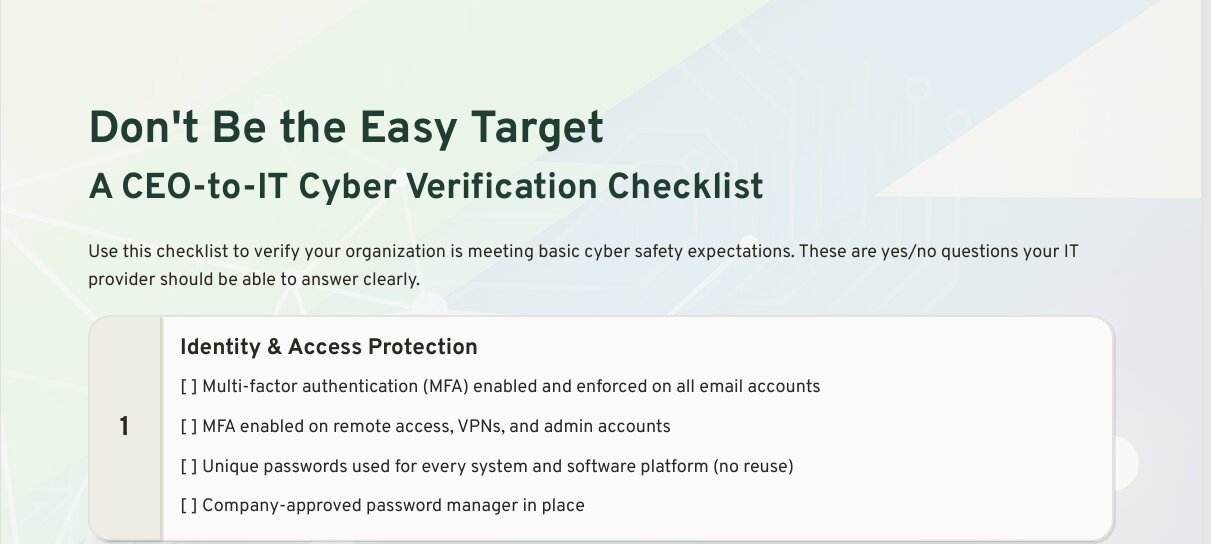 A CEO-to-IT Cyber Verification Checklist to confirm your organization is meeting basic cyber safety expectations—using simple yes/no questions your IT provider should answer clearly.